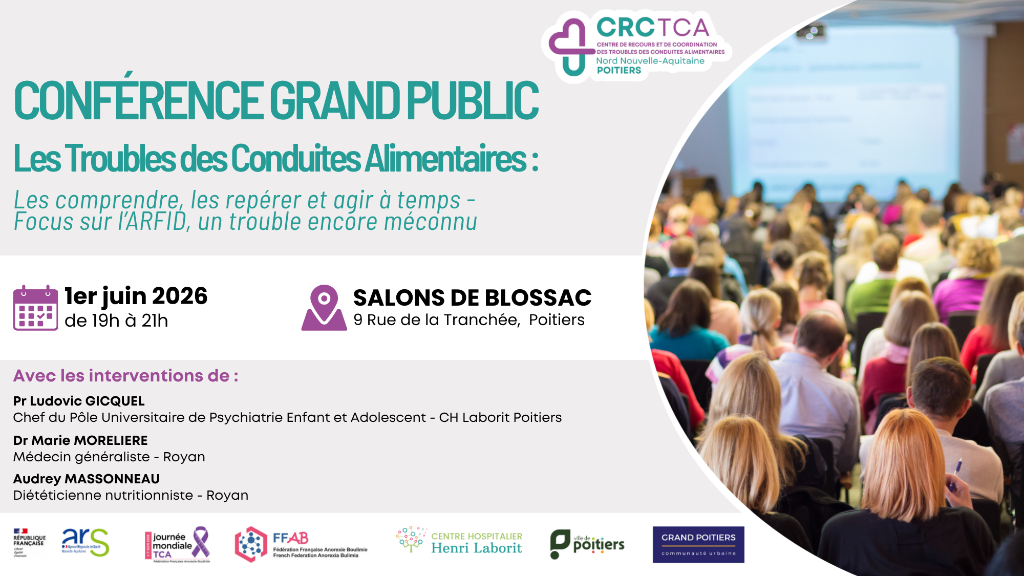 A l’occasion de la semaine nationale de sensibilisation aux Troubles des Conduites Alimentaires (TCA) du 1er au 7 juin 2026, supervisée par la Fédération Française Anorexie Boulimie (FFAB), le Centre de Recours et de Coordination des Troubles des Conduites Alimentaires (CRC TCA) Nord Nouvelle-Aquitaine Poitiers organise une conférence grand public sur les TCA le lundi 1er juin, à Poitiers.