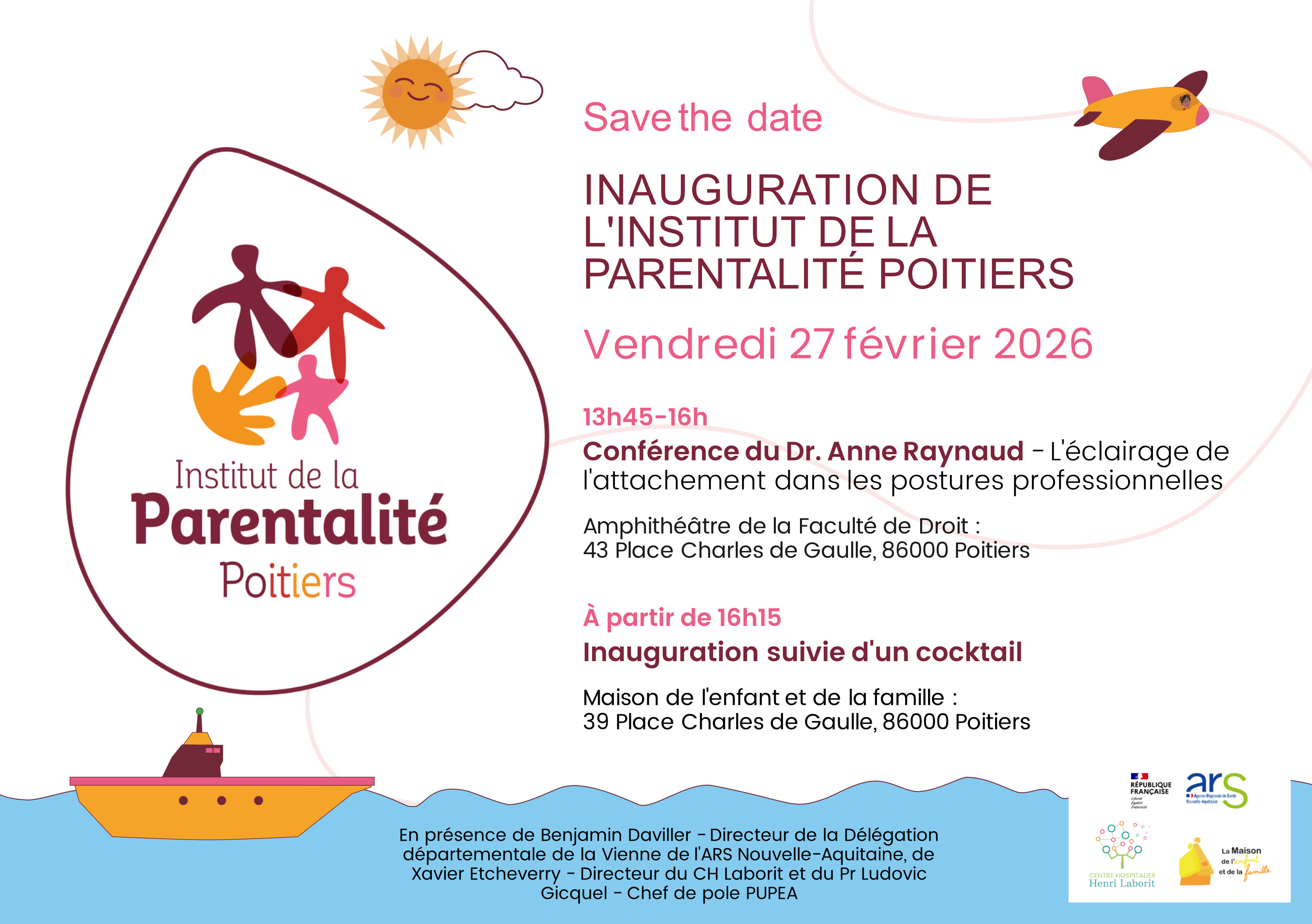 >Inscription Inauguration de l'Institut de la Parentalité - Poitiers Le vendredi 27 février 2026 (Accueil à 13h45) Conférence du Dr Anne RAYNAUD - de 14h à 16h Dr Anne Raynaud "L'éclairage de l'attachement dans les postures professionnelles" (La théorie de l'attachement) Amphithéâtre de la Faculté de Droit 43 Place Charles de Gaulle à Poitiers INAUGURATION [...]