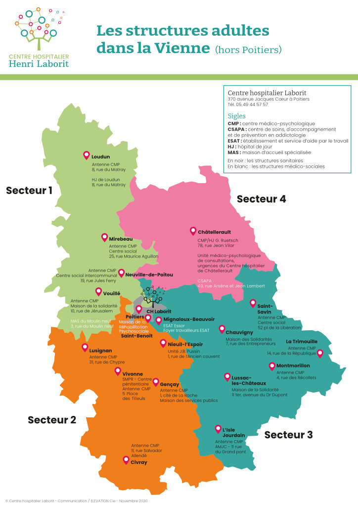 Situé dans la capitale régionale, le Centre Hospitalier Henri Laborit est implanté sur un domaine arboré de 40 hectares, mitoyen du centre hospitalo-universitaire (CHU), sur le site de la Milétrie, à 7 km de la gare de Poitiers.